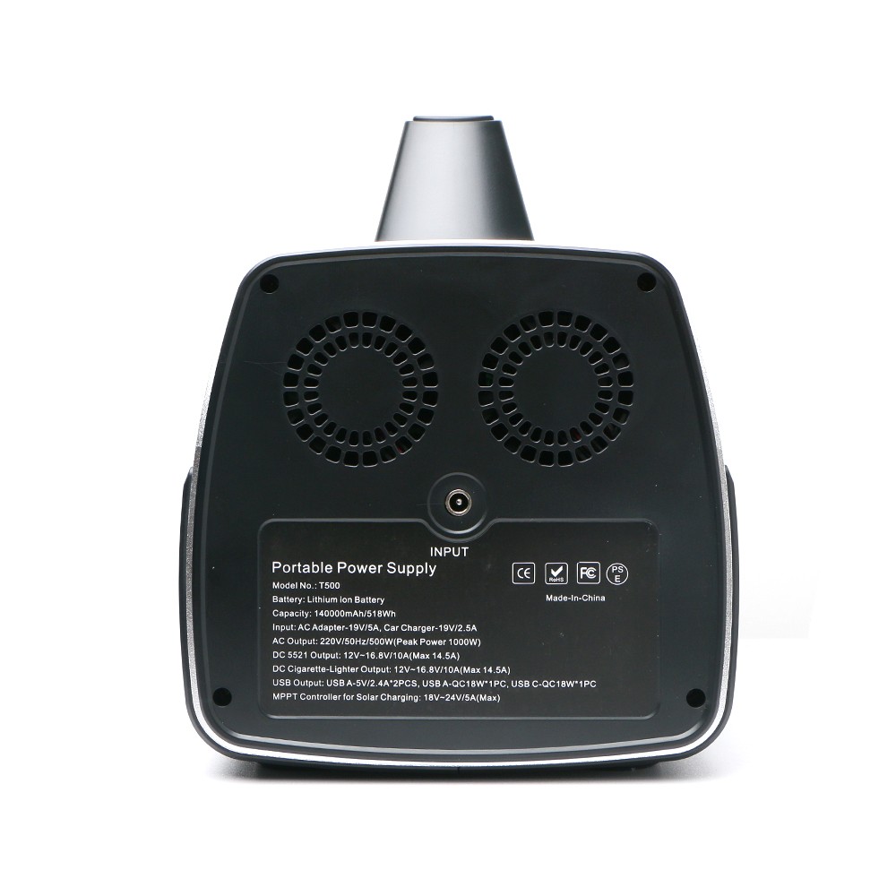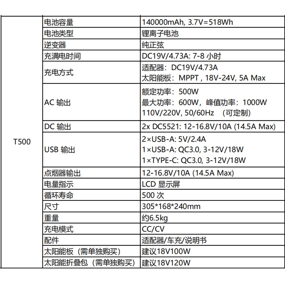 電(diàn)池容量 140000mAh, 3.7V=518Wh 電池類型 鋰離子電池 額(é)定(dìng)功率:500W 最大功率:600W,峰值功率:1000W 110V/220V, 50/60Hz (可定製) 電量指示 LCD 顯(xiǎn)示屏 循環壽命 500 次 尺寸 305*168*240mm 重量 約6.5kg